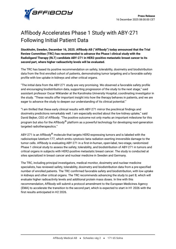 Stockholm, Sweden, December 16, 2025. Affibody AB (“Affibody”) today announced that the Trial Review Committee (TRC) has recommended to advance the Phase I clinical study with the Radioligand Therapy (RLT) candidate ABY-271 in HER2-positive metastatic breast cancer to its second part, where higher radioactivity levels will be evaluated.