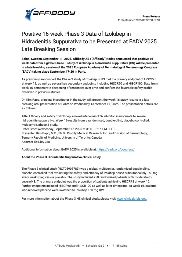 Solna, Sweden, September 11, 2025. Affibody AB (“Affibody”) today announced that positive 16-week data from a global Phase 3 study of izokibep in hidradenitis suppurativa (HS) will be presented in a late breaking session of the 2025 European Academy of Dermatology & Venereology Congress (EADV) taking place September 17-20 in Paris.